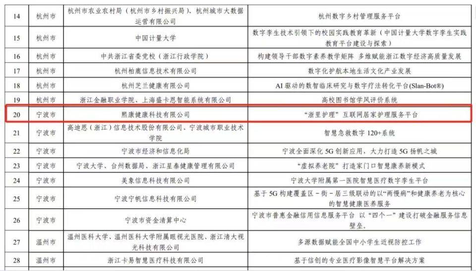 浙江省经济和信息化厅发布了《关于公布 2024 年浙江省数字经济发展优秀案例的通知》,熙康健康科技有限公司建设与运营的“浙里护理”互联网居家护理服务平台成功入选浙江省数字经济应用优秀案例,标志着浙理护理平台在推动浙江省数字经济高质量发展方面取得了显著成就与广泛认可。