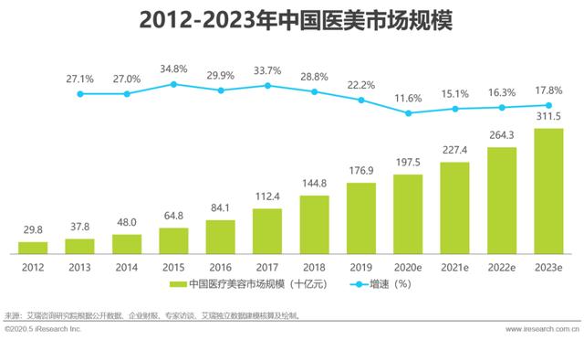 上游厂商、正规医美、黑医美,三者形成了一个畸形的怪圈,而这也给快速发展的医美市场狠狠踩了下刹车。据艾瑞数据显示,医美行业从2013年为起点进入爆发期直至2017年保持了超过30%的年复合增长率,但在去年,医疗美容市场规模增速降至22.2%。