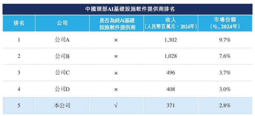 根据招股书披露,AI基础设施软件市场的提供商大致可分为纯AI基础设施软件提供商与非纯AI基础设施软件提供商。以2024年的收入计,星环科技是我国第五大AI基础设施软件提供商,市场份额仅为2.8%,同时也是该市场中最大的纯AI基础设施软件提供商。