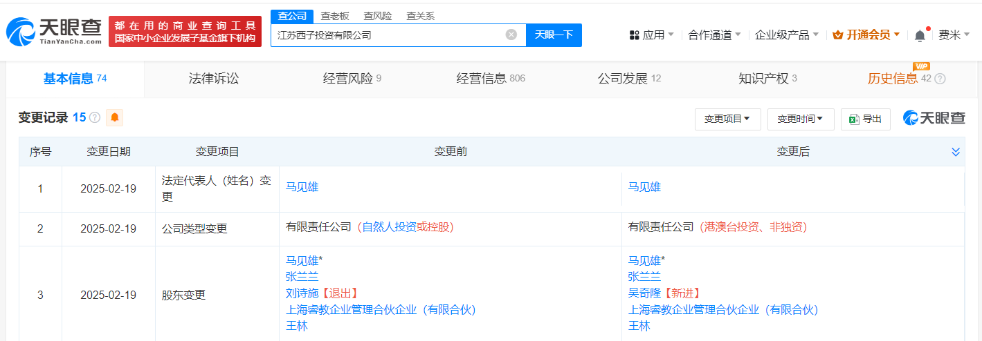 天眼查App显示,近日,江苏西子投资有限公司发生工商变更,原股东刘诗施(刘诗诗)退出,退出前刘诗施持有该公司5%的股份,新增吴奇隆为股东。