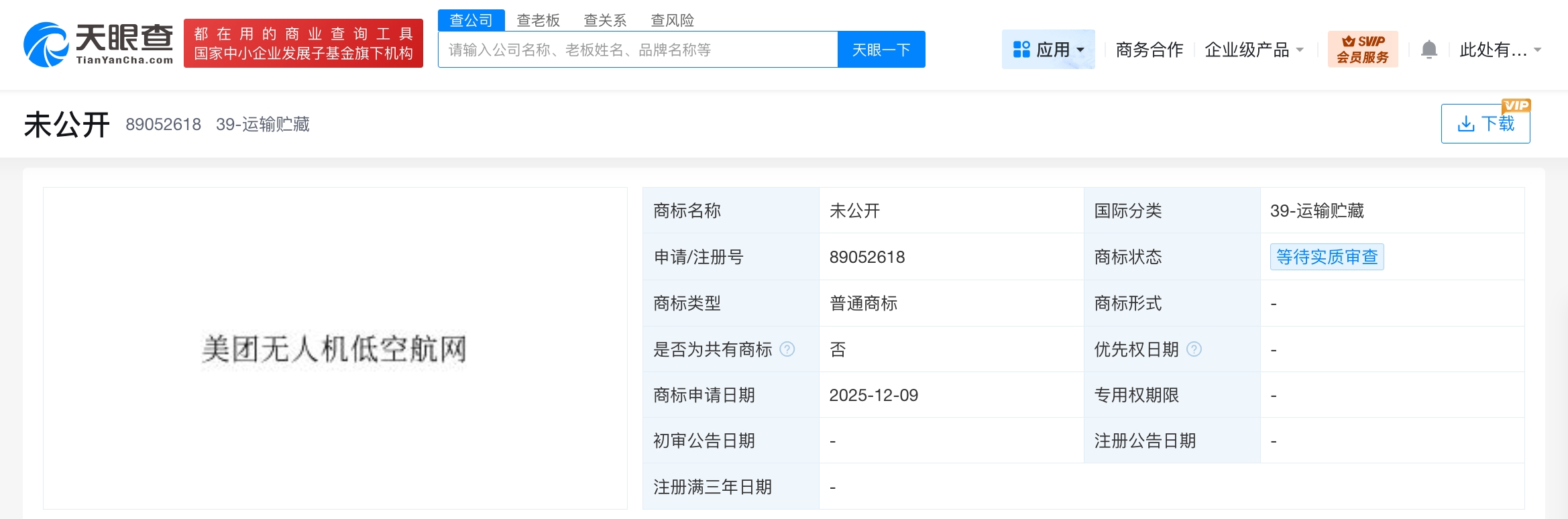 天眼查知识产权信息显示,近日,美团关联公司北京三快科技有限公司申请注册多枚“美团智能接驳机场”“美团无人机玄武云”“美团无人机云枢”“美团无人机低空航网”等商标,国际分类包括运输工具、运输贮藏等,当前商标状态均为等待实质审查。