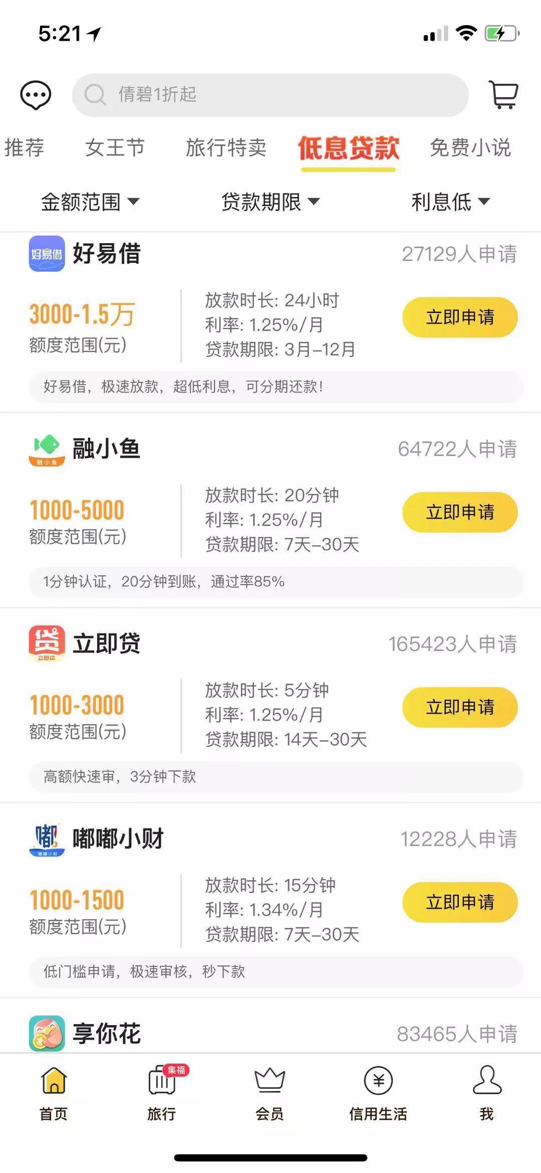 金小鲸下载小黑鱼app后发现,除商品购买、酒店预订等功能外,菜单栏的“低息贷款”格外醒目。其“低息贷款”页面主要为贷款超市功能,除了为洋钱罐借款、你我贷、闪银、用钱宝、小赢卡贷等借款平台导流外,列表中还有诸多疑似“马甲”平台。