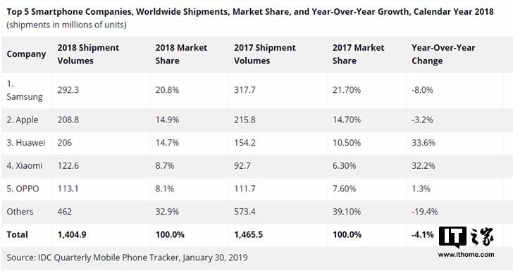 但在全球市场整体而言,苹果表现仍然并不差。据IDC发布的报告显示,在全球手机出货量下跌了4.1%的大环境下,2018年苹果手机出货量为2.088亿台,同比仅下跌3.2%;市场份额为14.9%,同比2017年的14.7%还略有上升,这表明苹果市场不景气的情况下守住了自己的基本盘。