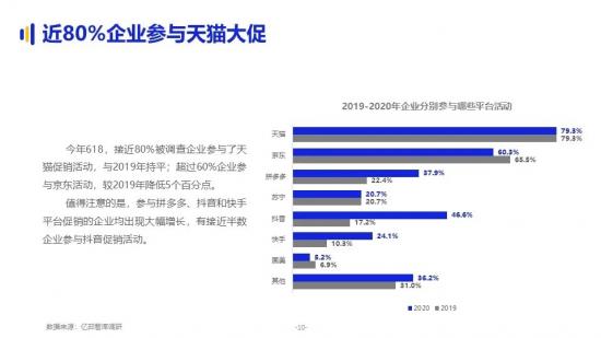 根据亿邦智库对品牌商的深入调查,今年618,有80%的受访企业参与天猫活动,参与天猫活动的品牌企业中有半数以上将年中大促预算的30%以上留给天猫。这其中,有10.6%的企业在天猫平台配置的预算超过80%;23.4%的企业将30%到50%预算放在天猫。4成受访企业表示,今年618半数以上销售额预计来自天猫。