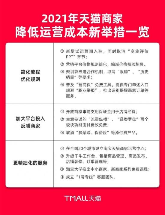 在降低商家的经营成本上,天猫一手精简了开店动作,手机操作即可完成申请;另一手减免费用减轻商家资金压力,比如调整了保证金政策,商家最高可预支一半保证金用于日常经营,同时,聚划算“参聚险”等被取消,而运营工具“生意参谋”实行部分免费。