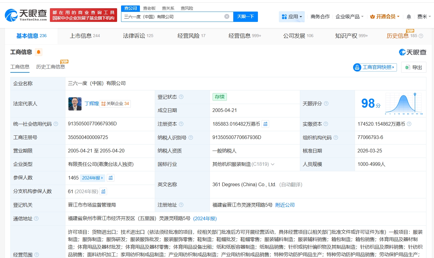 该公司成立于2005年4月,法定代表人为丁辉煌,经营范围包括服装制造、鞋制造、体育用品及器材制造等,由三六一度实业有限公司全资持股。
