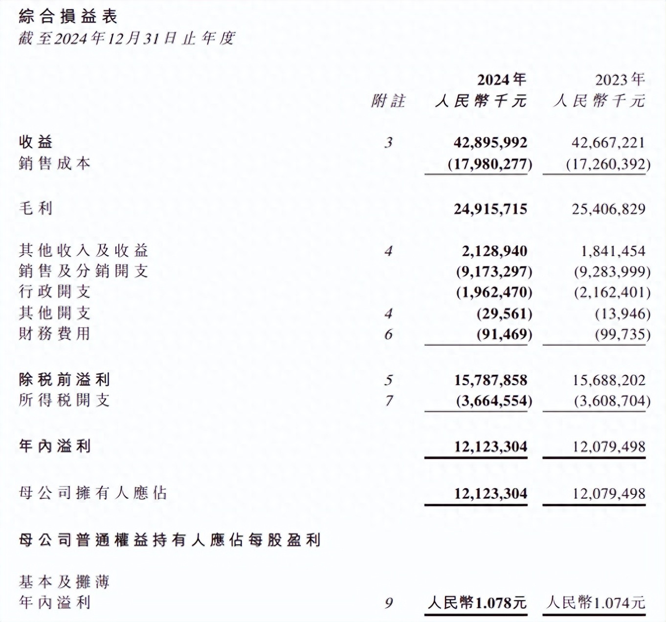 开支方面,农夫山泉2024年销售及分销开支为91.73亿元,上年同期为92.84亿元,同比减少1.2%,占营收比例为21.4%,上年同期占营收比例为21.8%,下降0.4个百分点。行政开支为19.62亿元,上年同期为21.62亿元,同比下降9.3%,占营收比例为4.6%,上年同期占营收比例为5.1%,下降0.5个百分点。财务费用由去年同期的100百万元减少至91百万元,略有下降。