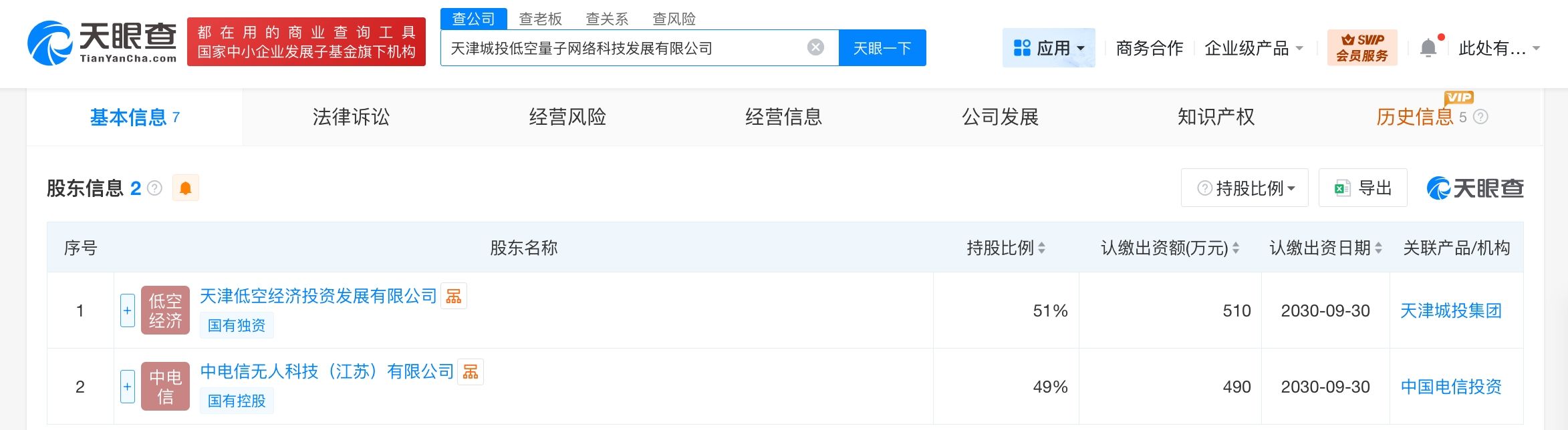 天眼查工商信息显示,近日,天津城投低空量子网络科技发展有限公司成立,法定代表人为王宝魁,注册资本1000万人民币,经营范围含智能无人飞行器销售、5G通信技术服务、数据处理和存储支持服务、互联网数据服务、通信设备销售、人工智能行业应用系统集成服务、信息系统集成服务、网络与信息安全软件开发等。股东信息显示,该公司由天津低空经济投资发展有限公司、中电信无人科技(江苏)有限公司分别持股51%、49%。