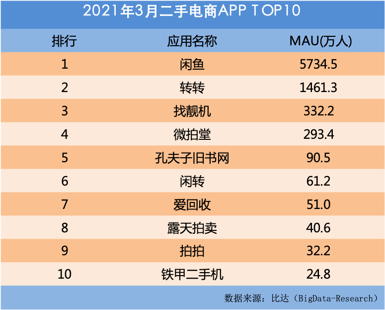 这也就导致补位的拍拍未能让爱回收成功收获C端。比达咨询发布的数据显示,在2020年3月,国内二手电商TOP10中,拍拍的MAU仅有32.2万,位列第9,爱回收仅以51万排名第7,二者的数据和头部平台相差悬殊。
