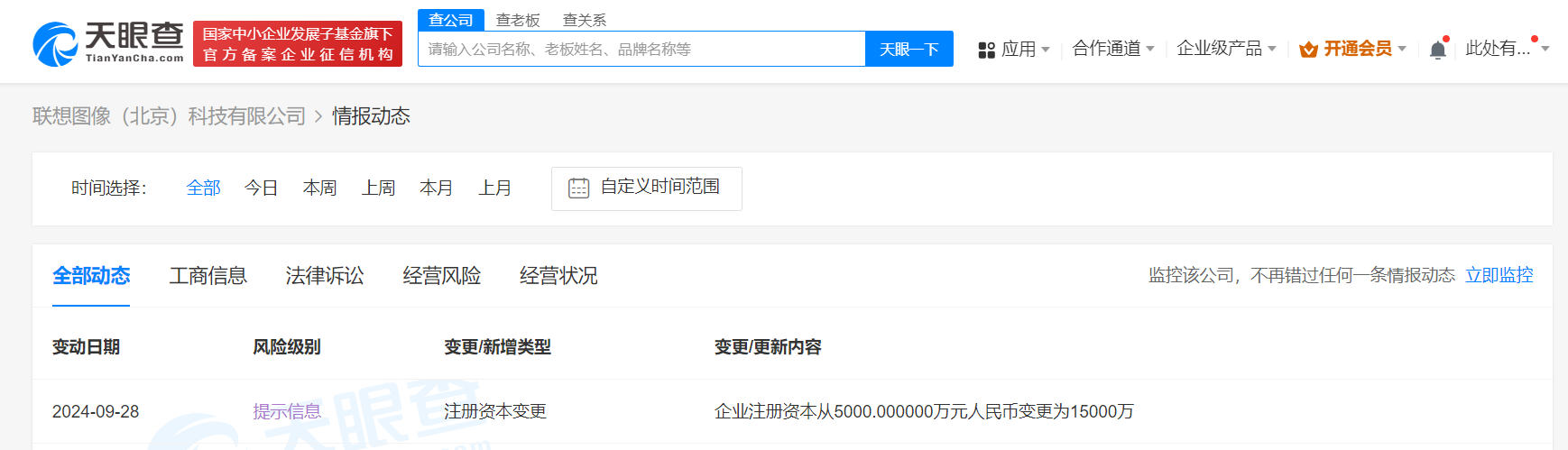 天眼查App显示,近日,联想图像(北京)科技有限公司发生工商变更,注册资本由5000万人民币增至1.5亿人民币。