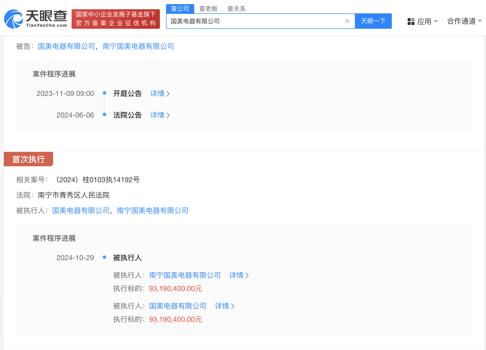 天眼查法律诉讼信息显示,10月29日,国美电器有限公司新增10条被执行人信息,执行标的合计2.5亿余元,涉及金融借款合同纠纷、租赁合同纠纷案件,部分案件被执行人还包括南宁国美电器有限公司、南宁国美物流有限公司等,执行法院为南宁市青秀区人民法院、东莞市第三人民法院。