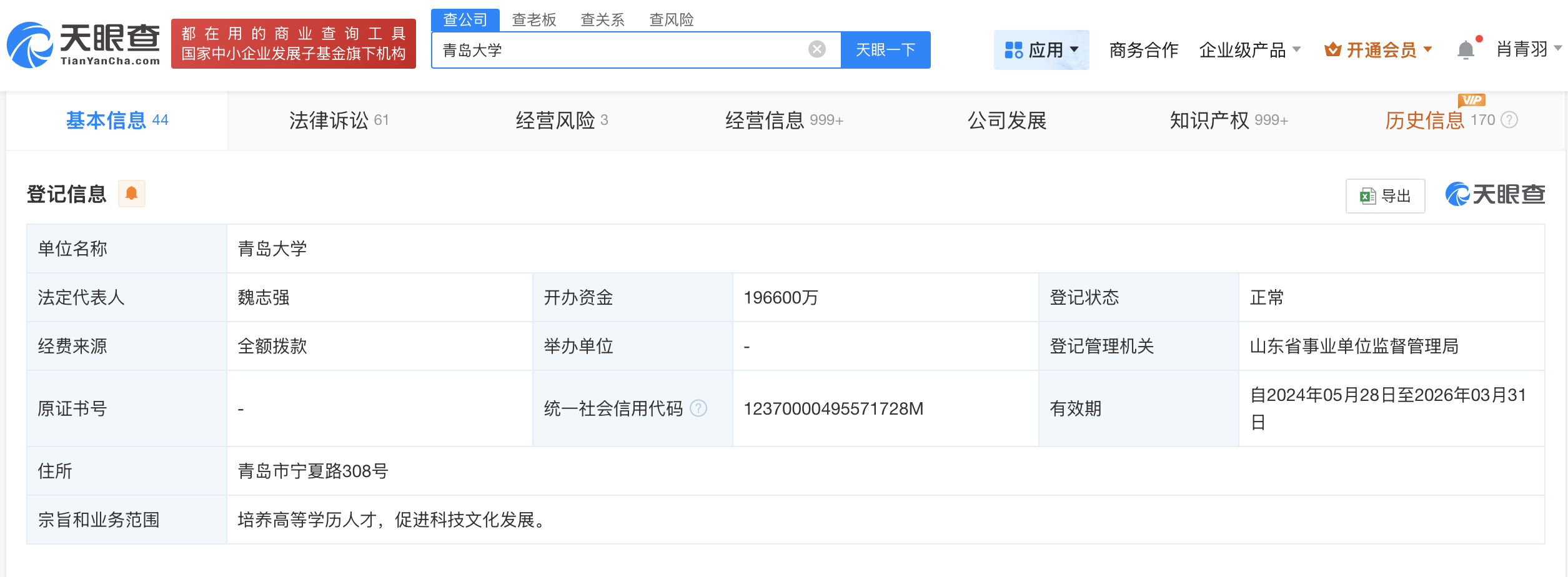 天眼查App显示,青岛大学法定代表人为魏志强,开办资金19.66亿人民币,经营范围为培养高等学历人才、促进科技文化发展,登记管理机关为山东省事业单位监督管理局。通过直接或间接持股,青岛大学拥有20余家企业实际控制权,其中6家为存续状态。招投标信息显示,2025年7月,青岛大学公告学生宿舍空调采购安装项目采购合同,合同显示,供货期为2025年8月31 日。