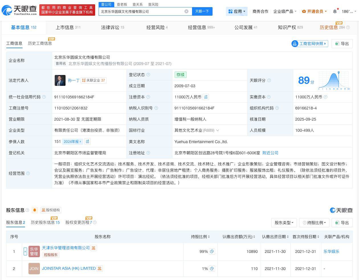 天眼查App显示,乐华娱乐关联公司北京乐华圆娱文化传播有限公司成立于2009年7月,法定代表人为孙一丁,注册资本1.1亿人民币,由天津乐华管理咨询有限公司、JOINSTAR ASIA (HK) LIMITED共同持股。知识产权信息显示,乐华娱乐关联北京乐华圆娱文化传播有限公司名下并无“王一博”相关商标。