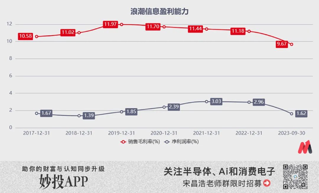 毛利率低,那么势必会对公司的净利润率造成较大的挤压。2023年前三季度,浪潮信息服务器及部件业务的毛利率只有9.67%,这一数据在2022年是11.18%,已连续五年下滑;而公司的净利润率也只有1.5%-3%。