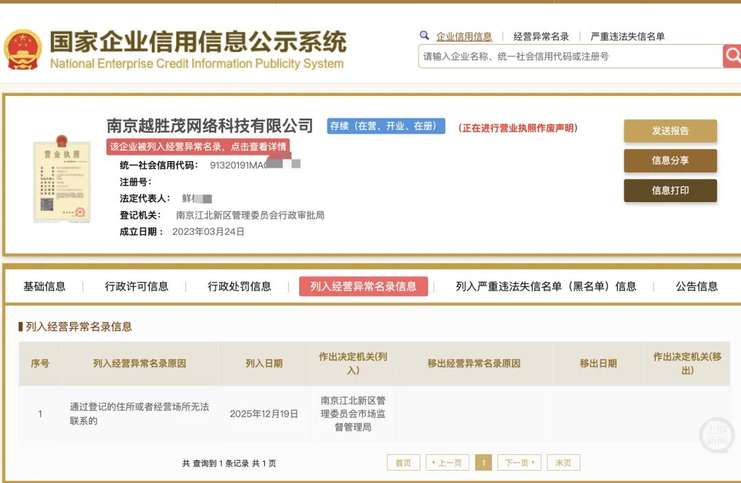 记者查阅国家企业信用信息公示系统看到,该公司已被列入经营异常名录,原因系“通过登记的住所或经营场所无法联系”,并有“正在进行营业执照作废声明”提示。