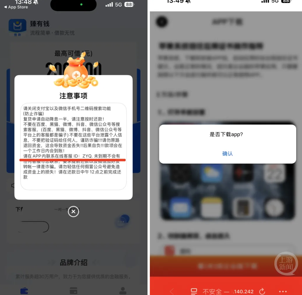 苹果商城下载提示(左)和软件内标注的还款金额。受访者供图