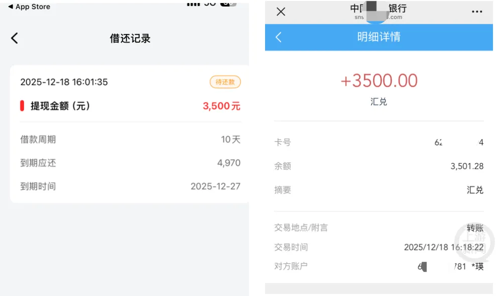 宫先生向记者提供的截图显示,“臻有钱”App页面明确标注:12月18日16:01提现3500元,10天后需还4970元,到期时间为12月27日。其银行流水截图显示,对方账户姓名为个人姓名“某瑛”。