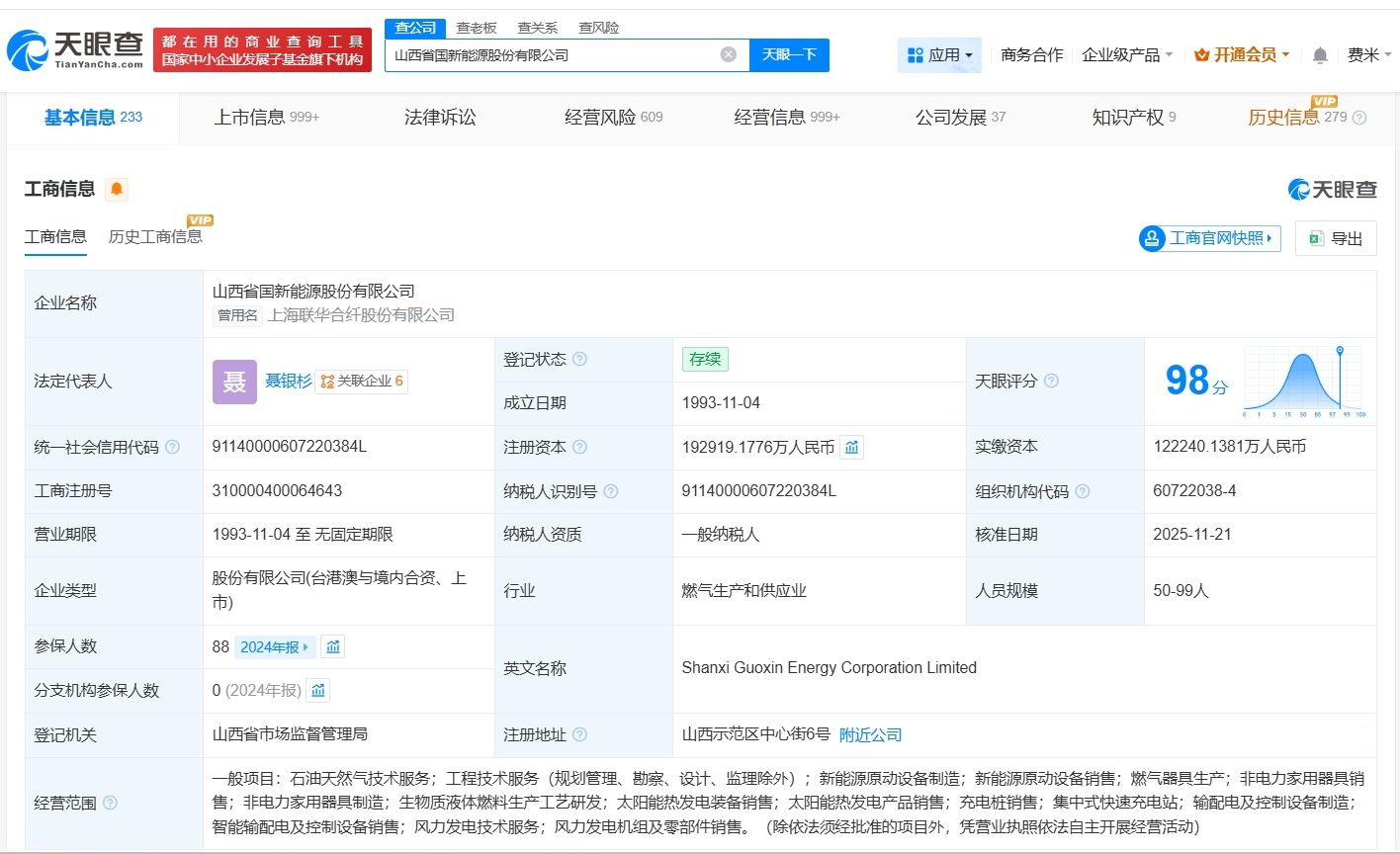 山西省国新能源股份有限公司成立于1993年11月,法定代表人为聂银杉,经营范围包括石油天然气技术服务、工程技术服务、新能源原动设备制造、新能源原动设备销售等。股东信息显示,该公司由华新燃气集团有限公司、太原市宏展房地产开发有限公司、卢文星等共同持股。
