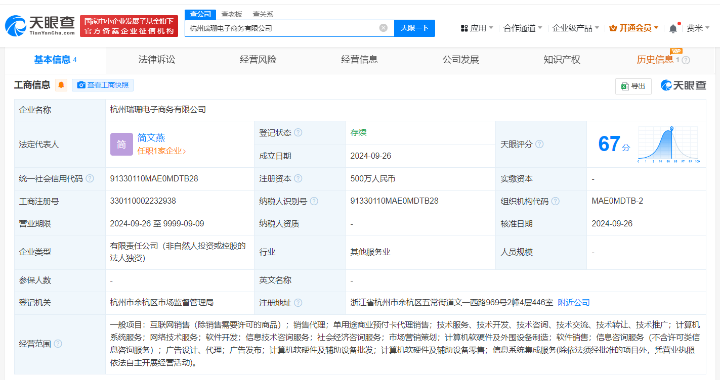 天眼查App显示,近日,杭州瑞珊电子商务有限公司成立,法定代表人为简文燕,注册资本500万人民币,经营范围含互联网销售、销售代理、单用途商业预付卡代理销售、计算机系统服务、网络技术服务、软件开发等。股东信息显示,该公司由淘天有限公司全资持股。