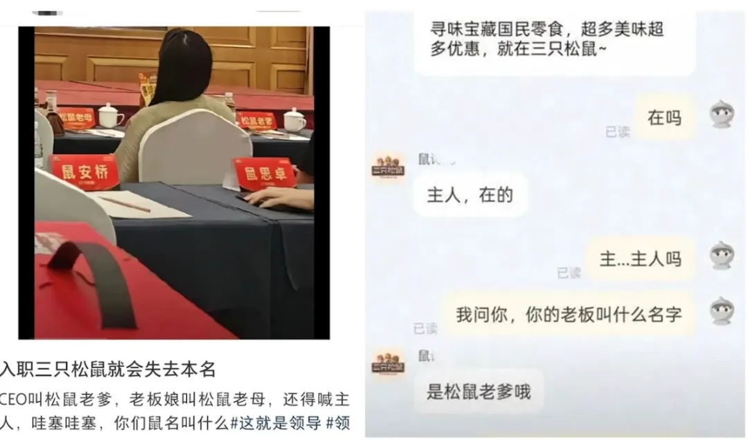 一名入职三只松鼠的新员工发现,自己被要求放弃本名,改称“鼠某某”。此帖一出,有人觉得“好玩又有创意”,但更多人直呼无法接受,尤其反感“鼠”字当头的称呼。毕竟,在中文语境里,“过街老鼠,人人喊打”早已深入人心,多数人的第一联想是老鼠而非松鼠。