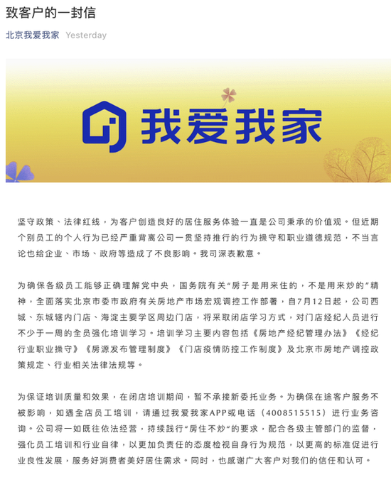 7月10日午间消息,北京我爱我家发布致客户公开信称,近期个别员工的个人行为已经严重背离公司一贯坚持推行的行为操守和职业道德规范,不当言论也给企业、市场、政府等造成了不良影响。自7月12日起,公司西城、东城辖内门店、海淀主要学区周边门店,将采取闭店学习方式,对门店经纪人员进行不少于一周的全员强化培训学习。在闭店培训期间,暂不承接新委托业务。