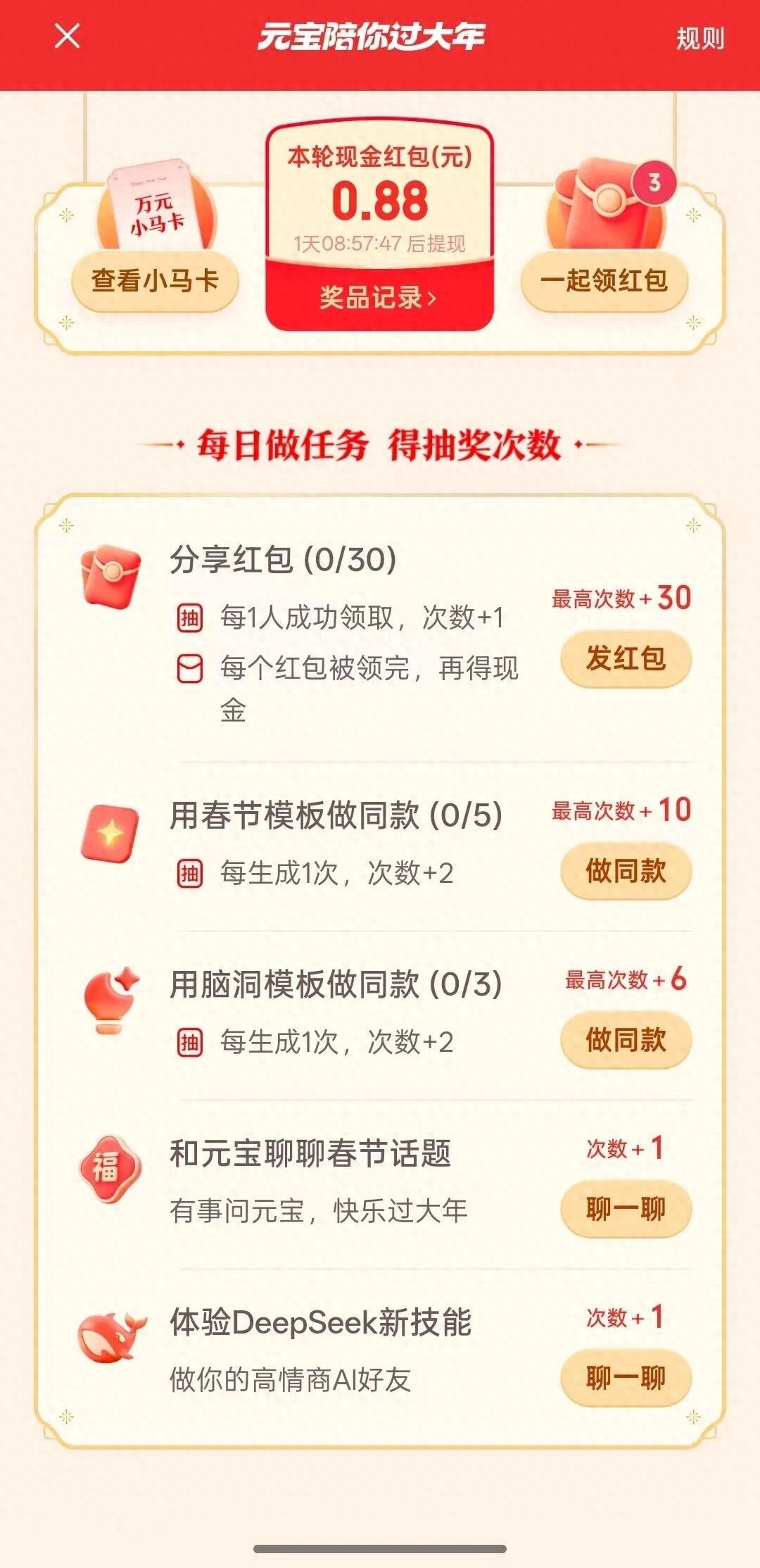 争议的导火索,是腾讯旗下AI应用“元宝”2月1日0点启动的春节红包活动。马化腾此前在员工大会上直言,要靠这场活动“重现11年前微信红包的辉煌”,试图用10亿现金破解元宝的用户困境。据悉,活动核心玩法直指社交裂变:用户可一键转发红包至微信、QQ,每有1人领取,分享者就多1次抽奖机会,上限30次,而限量100张的“万元小马卡”,更是让无数用户熬夜蹲守、疯狂转发。