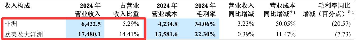 此外,公司国际业务的拓展也问题重重。2018年之前,欧美及大洋洲是中兴通讯海外业务的主要营收来源,营收占比一度超过25%,但随着美国制裁的加剧,欧美及大洋洲市场营收占比大幅下降。到2024年,该区域营收占比仅有14.41%。与此同时,非洲市场营收占比显著增加,从2017年的3.46%涨至5.29%,成为新的增长点。只是,虽然2024年国际市场收入同比增长4.04%,但毛利率却下降了10.56个百分点,这表明亚非等新兴市场在带来收入增长的同时,也面临着成本上升等压力。