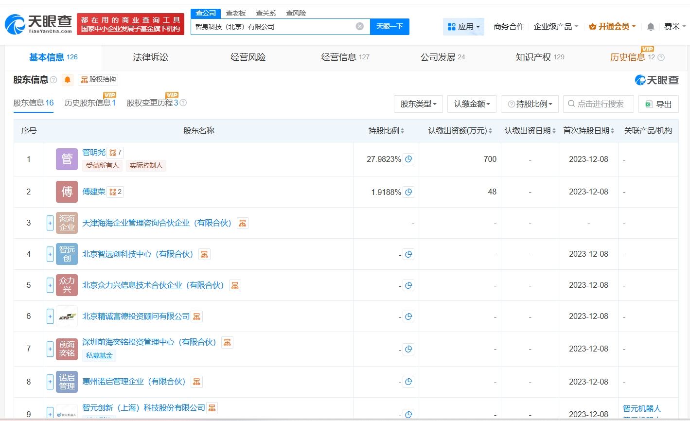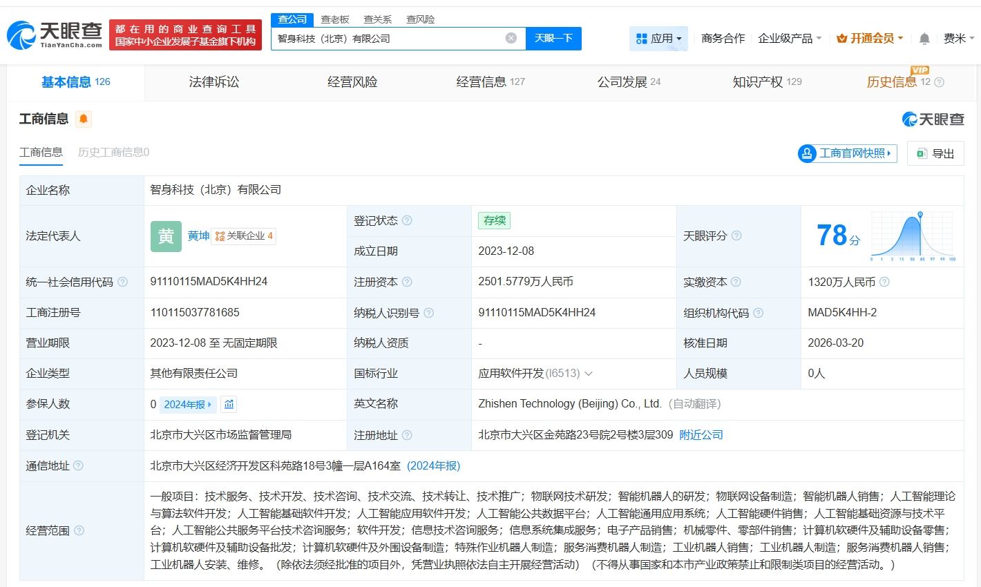 智身科技(北京)有限公司成立于2023年12月,法定代表人为黄坤,经营范围含智能机器人的研发、人工智能应用软件开发、工业机器人制造等。股东信息显示,该公司现由管明尧、智元机器人关联公司智元创新(上海)科技股份有限公司及上述新增股东等共同持股。公开资料显示,该公司聚焦具身智能机器人的产业化落地。