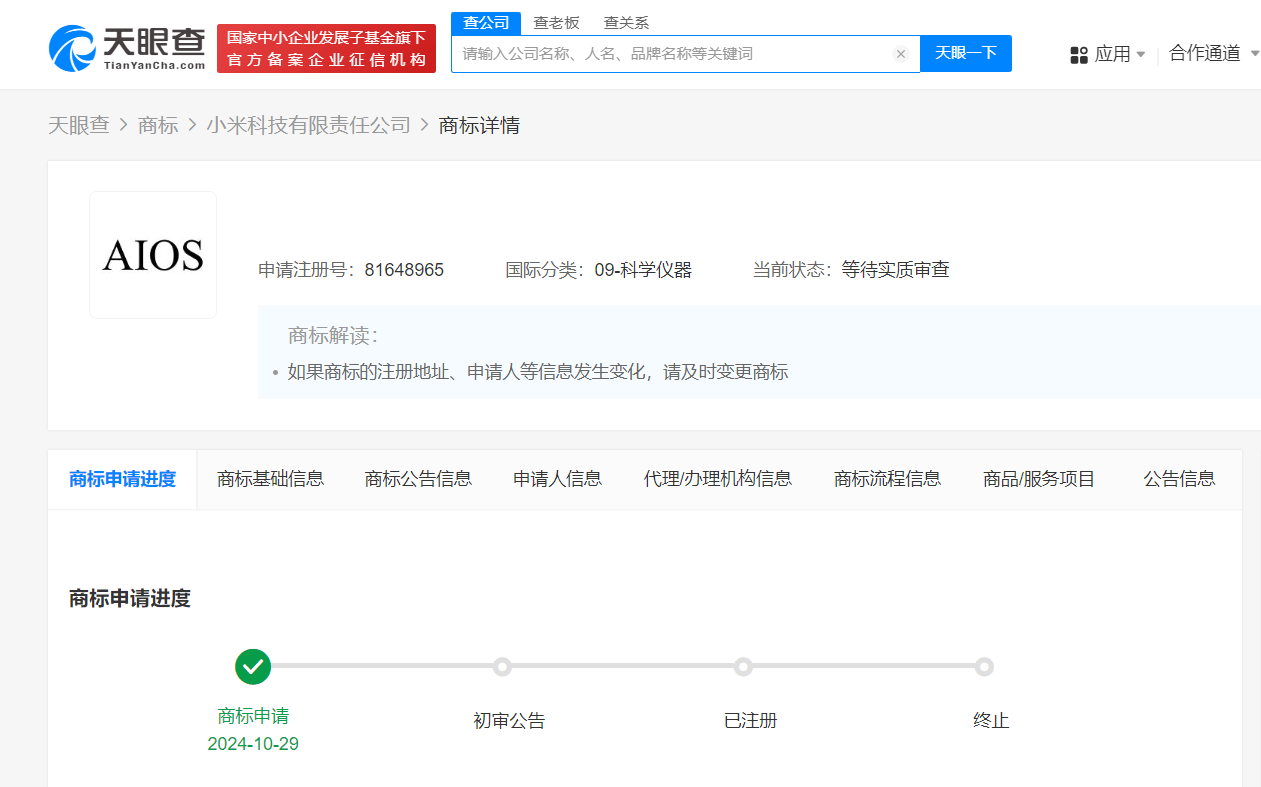 天眼查知识产权信息显示,近日,小米科技有限责任公司申请注册“超级小爱主动智能”“小米赛道”“赛道大师”“AIOS”等商标,国际分类涉及科学仪器、运输工具、网站服务等,当前商标状态均为等待实质审查。