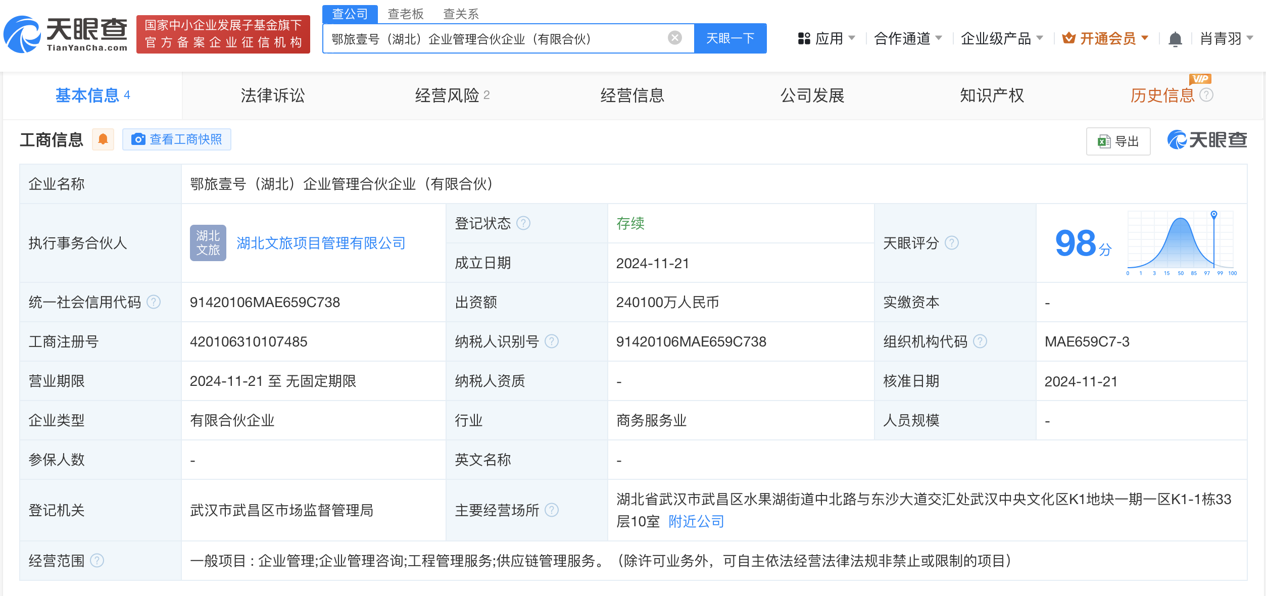 天眼查App显示,近日,鄂旅壹号(湖北)企业管理合伙企业(有限合伙)成立,执行事务合伙人为湖北文旅项目管理有限公司,出资额约24亿人民币,经营范围为企业管理、企业管理咨询、工程管理服务、供应链管理服务。合伙人信息显示,该合伙企业由湖北西岸玖号企业管理合伙企业(有限合伙)、湖北文旅园区建设发展集团有限公司、湖北文旅项目管理有限公司共同出资。