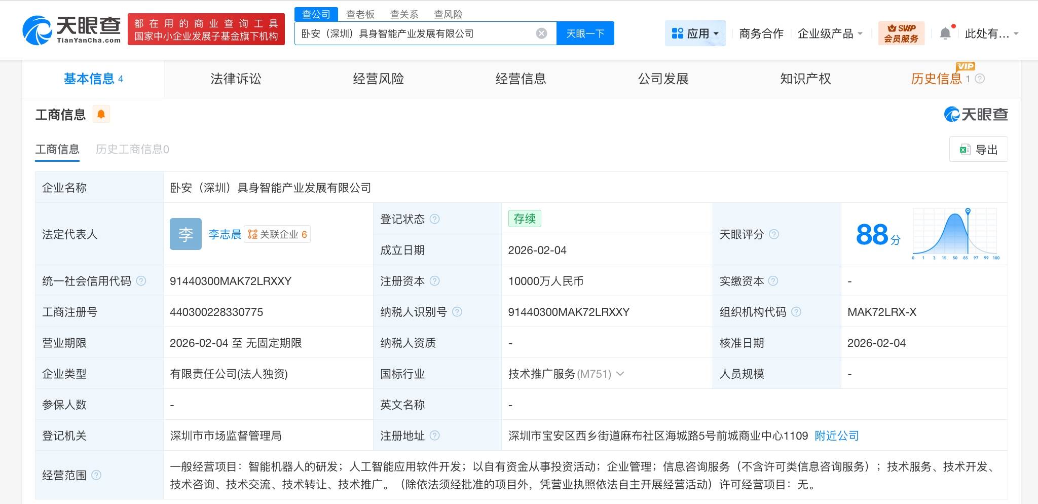 天眼查App显示,近日,卧安(深圳)具身智能产业发展有限公司成立,法定代表人为李志晨,注册资本1亿人民币,经营范围为智能机器人的研发,人工智能应用软件开发,以自有资金从事投资活动,企业管理,信息咨询服务,技术服务、技术开发、技术咨询、技术交流、技术转让、技术推广。股东信息显示,该公司由卧安机器人(深圳)股份有限公司全资持股。
