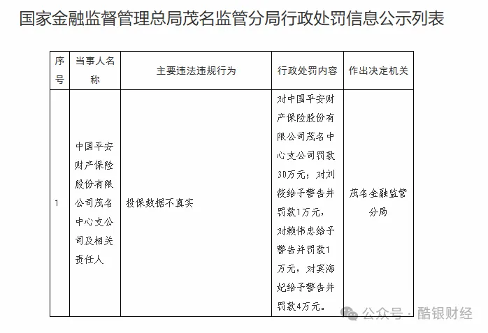 按监管官网公开时间,3月3日,平安财险茂名中心支公司因投保数据不真实被罚30万元,3名责任人同步受罚;更早前,1月20日,平安财险呼和浩特中心支公司因未按规定使用经批准或备案的保险条款费率、费用列支不真实被罚83万元,2月3日,时任总经理白亚利又被警告并罚款13万元。
