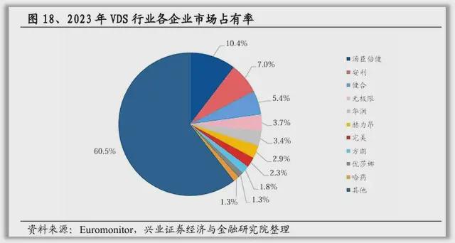 兴业证券研报显示, 2023年汤臣倍健市占率为10.4%,稳稳的占据国内VDS市场的龙头地位,市场的二、三名分别是安利与健合,市场占有率分别为7%与5.4%。目前,国内的竞争格局相对比较分散,行业CR3仅有22.8%。