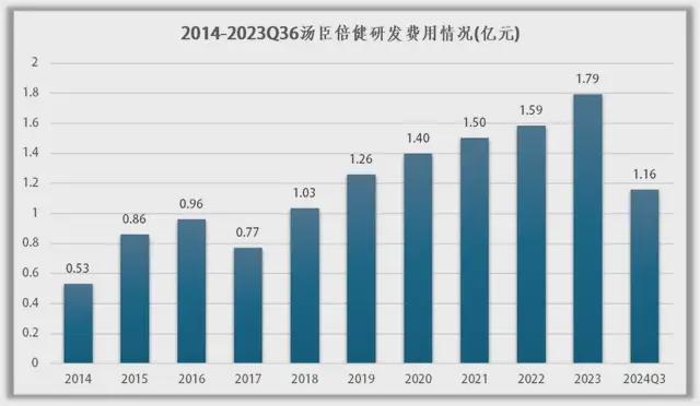 自2014开始,除2017年以外,汤臣倍健研发费用整体呈现增长趋势,但最高仅有1.79亿元,2023年汤臣倍健营业收入为94.07亿元,约占当年营业总收入的1.9%,不到2%。