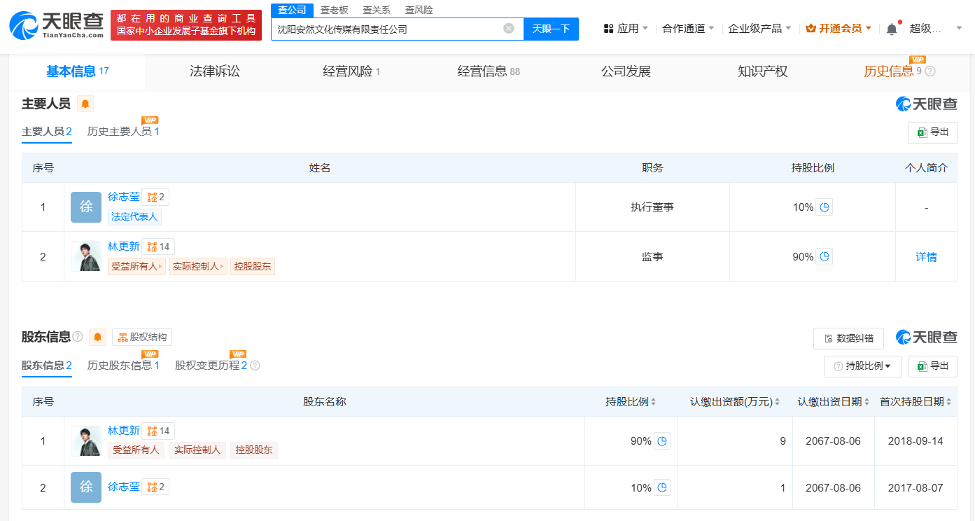 该公司成立于2017年8月,法定代表人为徐志莹,注册资本10万人民币,经营范围包括文化艺术交流活动策划、动漫设计、商务代理服务等,由林更新、徐志莹分别持股90%、10%。值得注意的是,2024年3月,该公司退出北京九亿梦影视文化有限公司股东行列,目前北京九亿梦影视文化有限公司大股东为徐志莹。