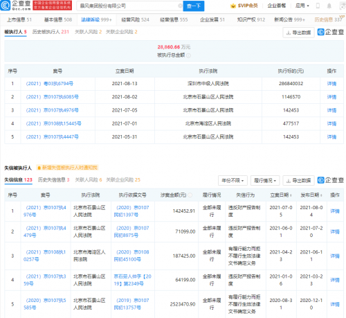企查查风险信息显示,暴风集团股份有限公司目前共有被执行人信息5项、失信信息123项、限制高消费信息191项。