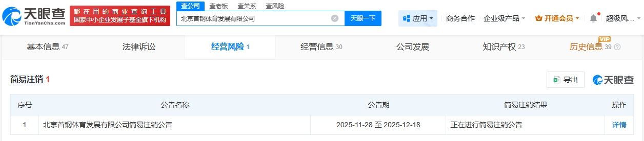 天眼查App显示,近日,北京首钢体育发展有限公司新增1条简易注销公告,公告期为11月28日至12月18日。