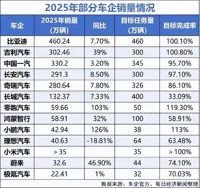 公开资料显示,2025年,长城汽车以132.37万辆的销量仅完成400万辆目标任务的33.09%,成为榜单中目标完成率最低的企业。