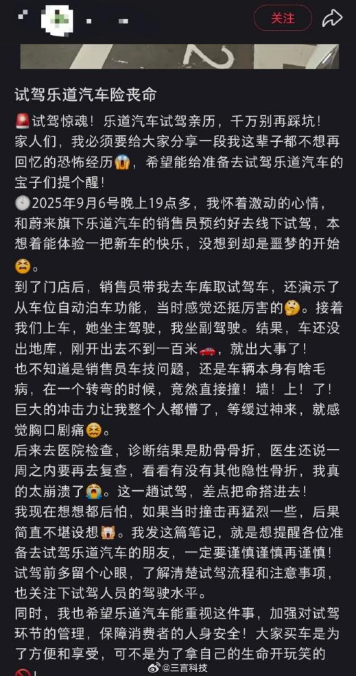 9 月 8 日,在社交平台上,有网友反映在试驾乐道汽车时发生严重事故,险些 " 丧命 "。