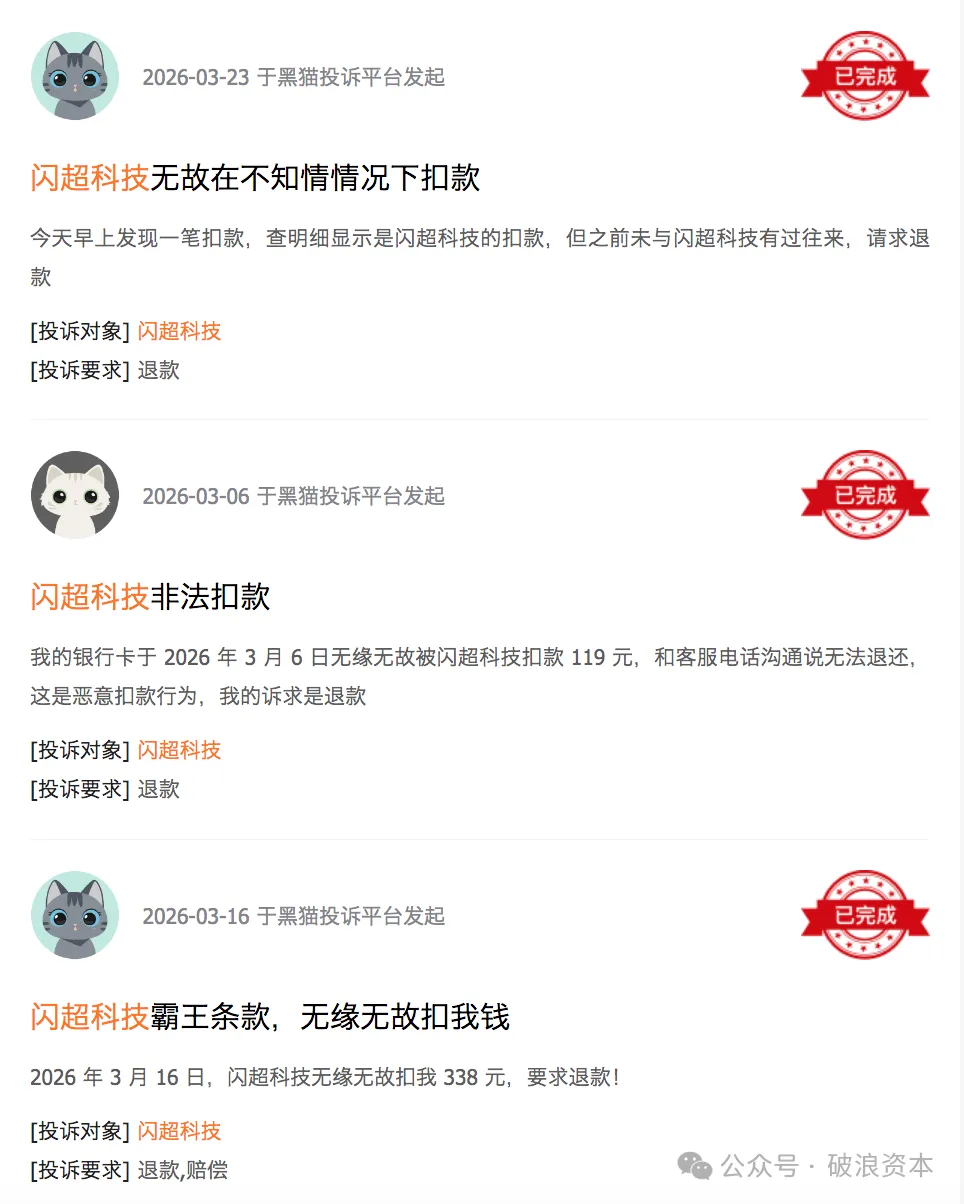 黑猫投诉、消费保等平台的投诉数据,勾勒出闪超科技违规扣费的态势。破浪资本梳理发现,近30天内,闪超科技相关投诉量已达54条,几乎所有投诉都指向“未告知扣费”“强制捆绑会员”“退款遭拒”三大核心问题,而默认勾选、隐藏提示,正是其实现违规扣费的核心套路。