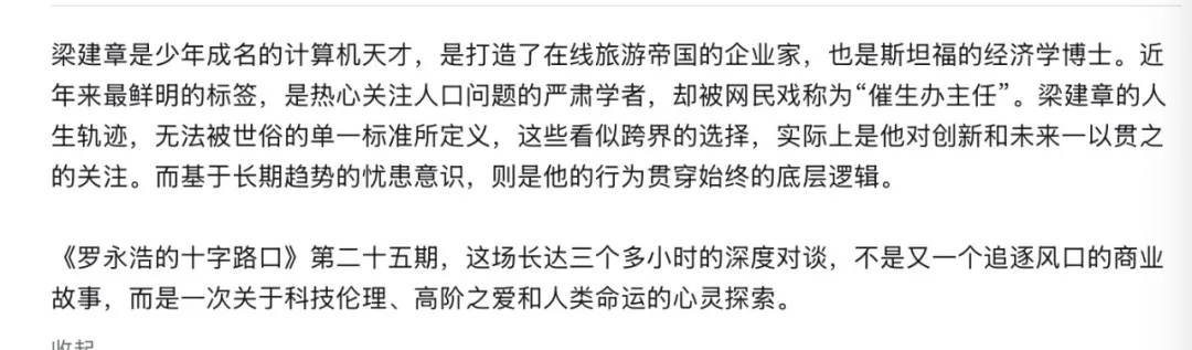 当我刷到梁建章上罗永浩播客的那段介绍语时,我整个人是处于一种极度震撼且间歇性失灵的状态。