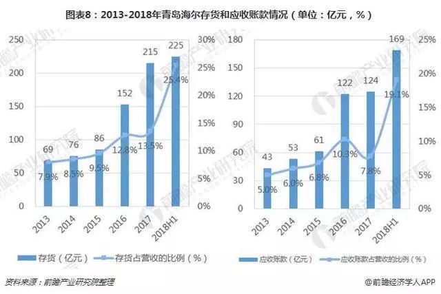 其次,张瑞敏曾说,推动人单合一能够降低库存。但到2018年年中,青岛海尔账面的存货已经达到了225亿元,同时应收账款也在翻倍上涨:2015年末,海尔账面的应收账款还只有61亿元,到了2018年年中,已经是169亿的巨额数字,近原来的4倍。并且应收账款占营收的比例也在同步提高。