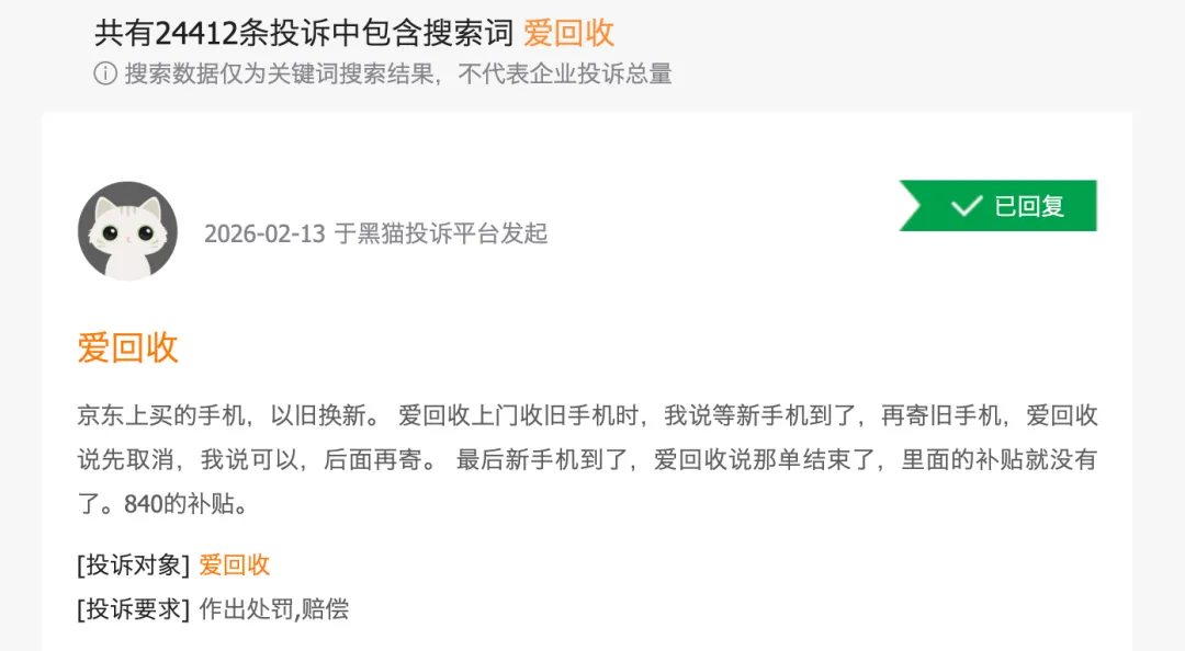 线下门店作为爱回收最重的资产,不仅是流量的入口,更是信任的背书。但在快速扩张的过程中,管理半径的拉大、人员培训的滞后,导致服务质量参差不齐。在黑猫投诉平台上,以“爱回收”为关键词的消费者投诉累计已接近2.5万条。这一数字本身,已成为悬挂在爱回收品牌形象上的一把达摩克利斯之剑。