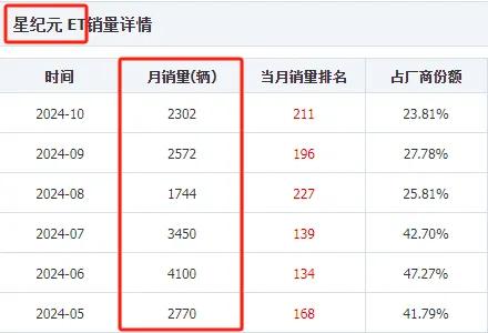 金九银十月份,星纪元ET销量分别是2572辆和2302辆,销量很稳定,但是这个数据也说明卖的不好。