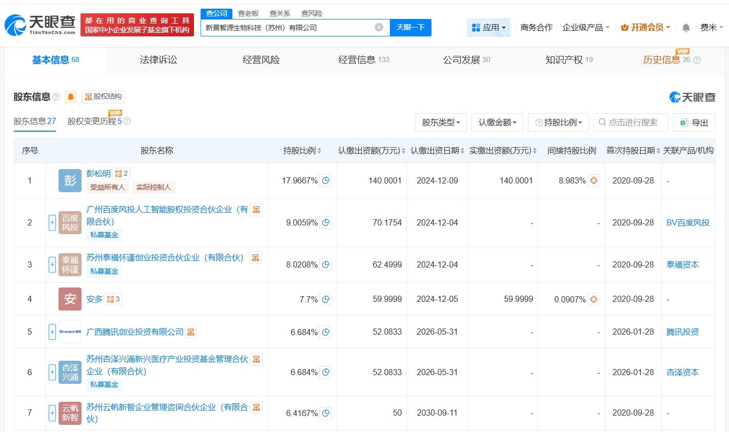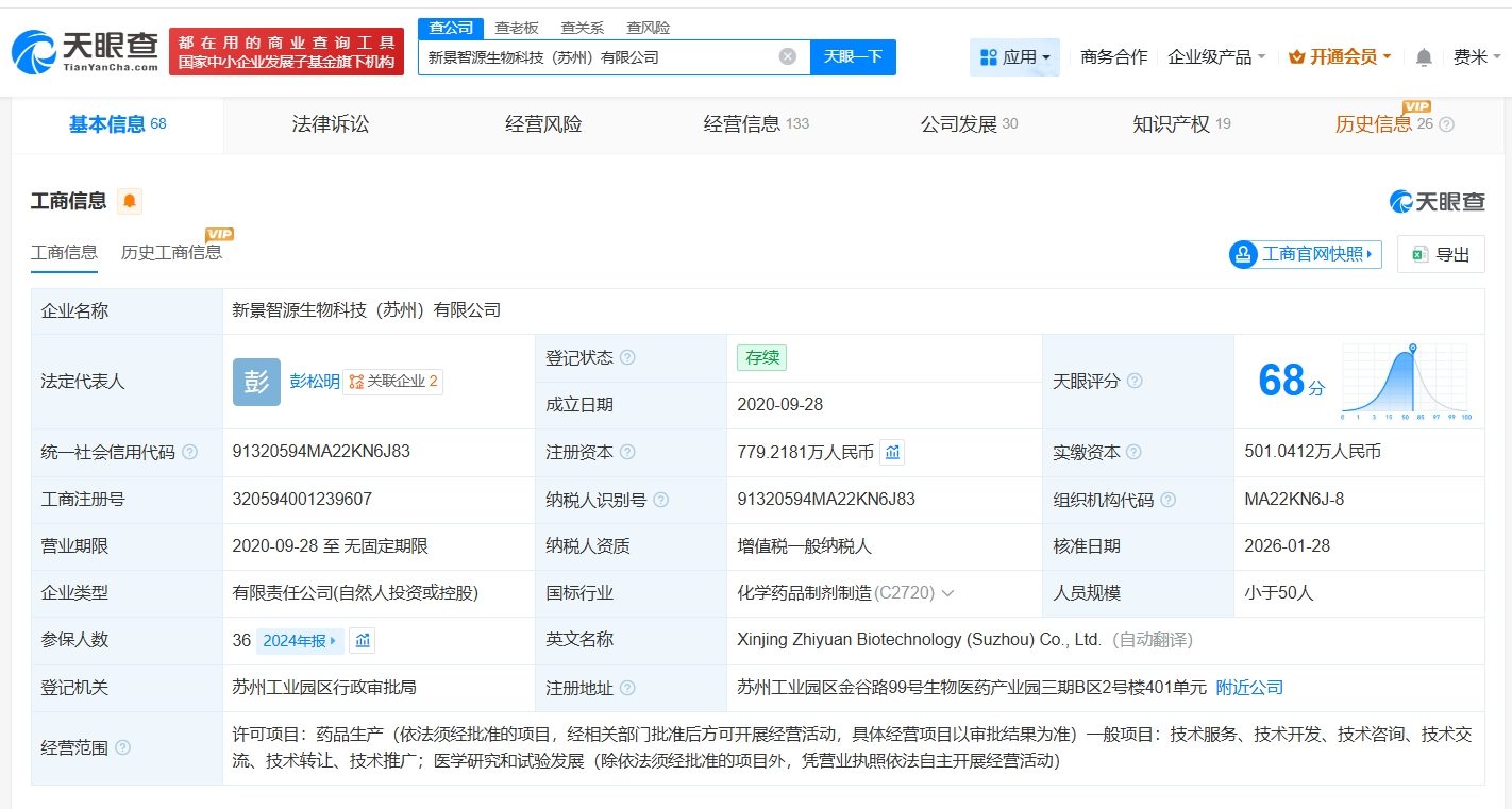 天眼查App显示,近日,新景智源生物科技(苏州)有限公司发生工商变更,新增广西腾讯创业投资有限公司、温州同高创悦创业投资合伙企业(有限合伙)等为股东,同时,注册资本由约628.07万人民币增至约779.22万人民币。