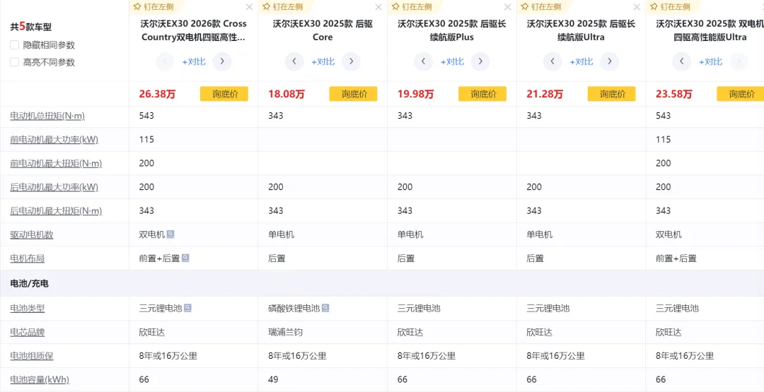 相关信息显示,沃尔沃EX30目前在售的五个版本中,除了后驱Core版本搭载瑞浦兰钧的磷酸铁锂电池,其余版本均为欣旺达的三元锂电池。