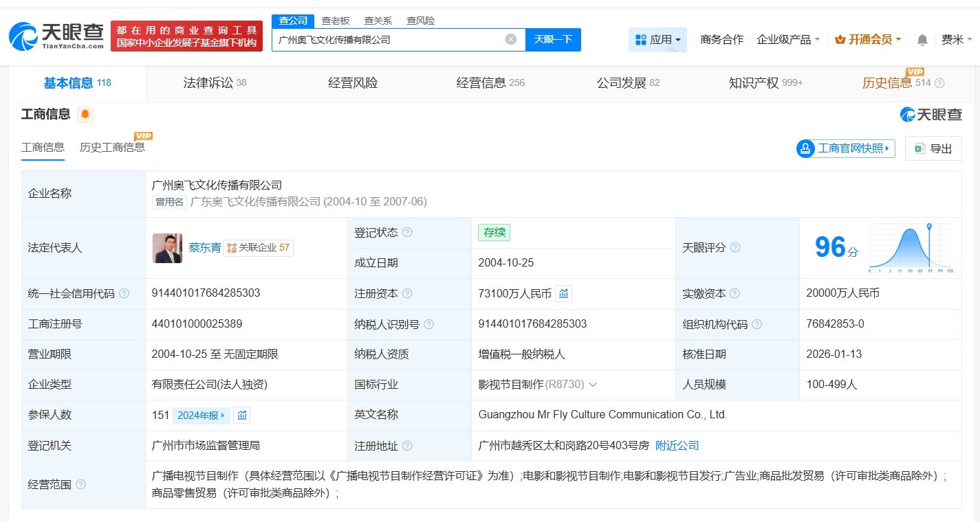 广州奥飞文化传播有限公司成立于2004年10月,法定代表人为蔡东青,经营范围包括广播电视节目制作、电影和影视节目制作、电影和影视节目发行等。股东信息显示,该公司由奥飞娱乐(002292)全资持股。