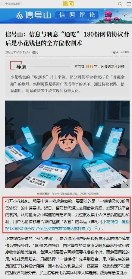 2025年底,“信网/信号新闻”等媒体曝光的“一键授权180份网贷协议”事件,揭开了小花钱包数据合规的遮羞布,其过度收集、违规共享用户个人信息的乱象,触目惊心。