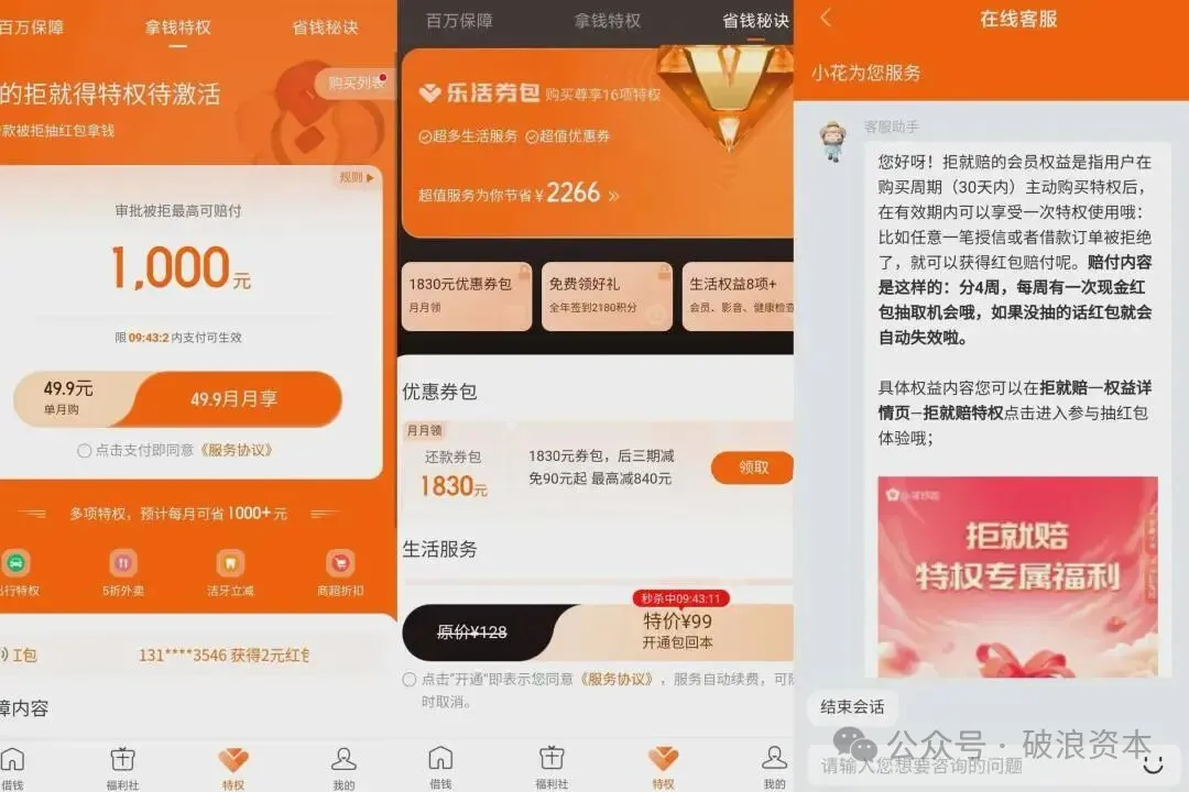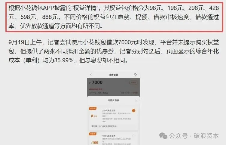 破浪资本实测发现,在小花钱包借款7000元,若无平台会员,借款利率高达35.99%,已接近监管红线;若购买会员,明面利率虽降至24%,但叠加每月428元的会员费后,综合年化成本竟高达132%,远超监管规定的24%司法保护上限。