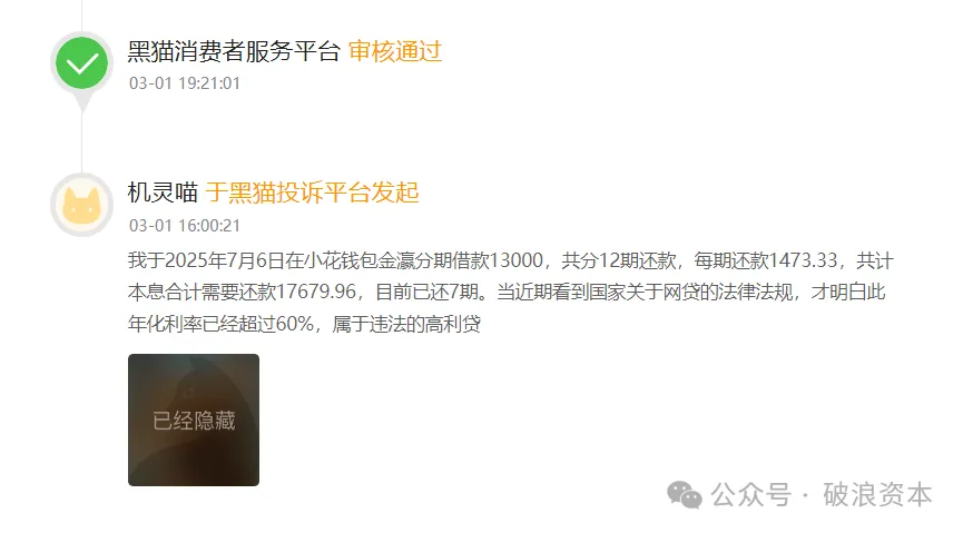 黑猫投诉平台上,此类投诉比比皆是。2026年3月1日,有用户反馈,其在小花钱包旗下金赢分期借款13000元,分12期还款,每期还款1473.33元,本金及利息合计需还款17679.96元,用户测算年化利率超60%,即便剔除计算误差,实际年化也达36%,远超监管红线。